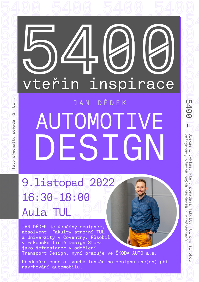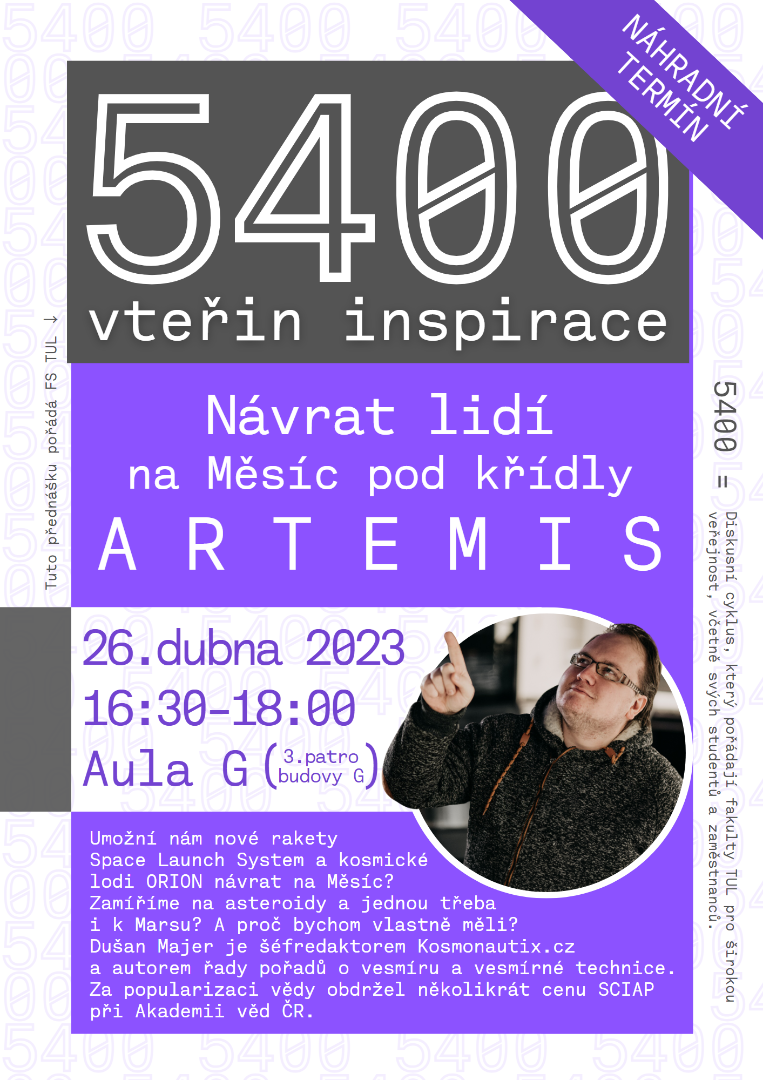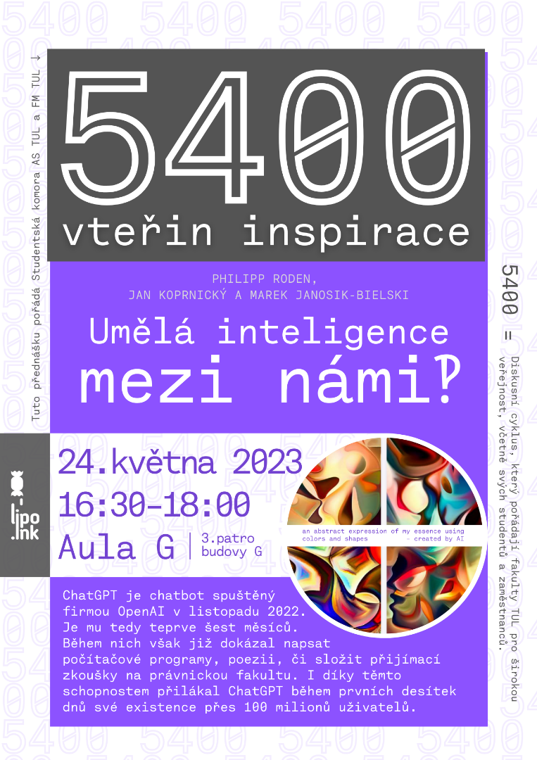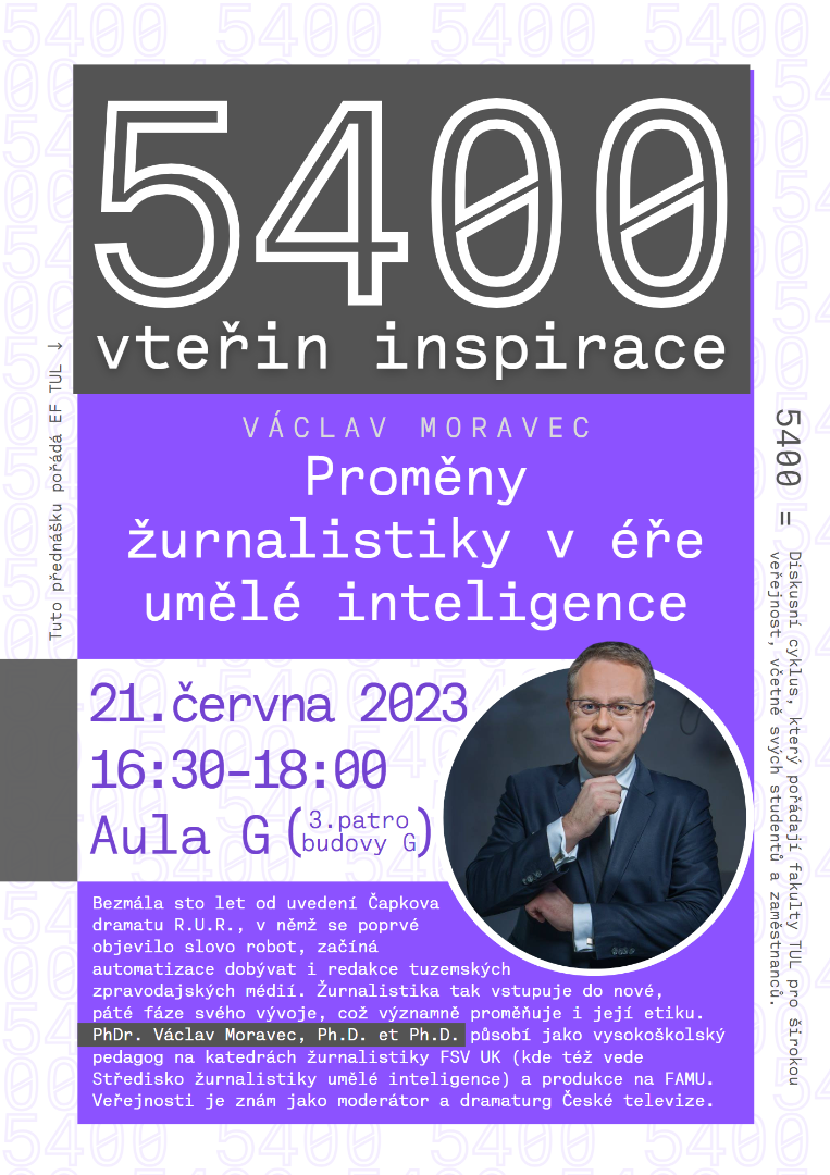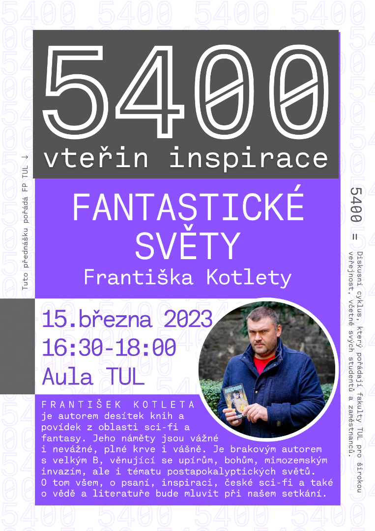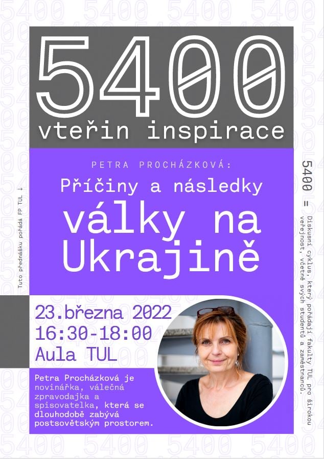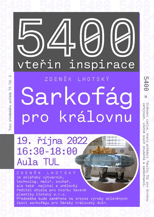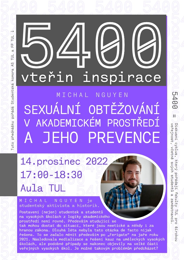 Ve spolupráci s Fakultou přírodovědně-humanitní a pedagogickou spolupořádáme cyklus přednášek a diskusí „5400 vteřin inspirace“, který se koná zpravidla každou třetí středu v měsíci od 16:30 v aule TUL (budova G, Univerzitní náměstí 1410/1) v období měsíců říjen až květen.